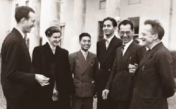 资料照片:1947年,程开甲(左三)与国际学术会议代表进行交流
