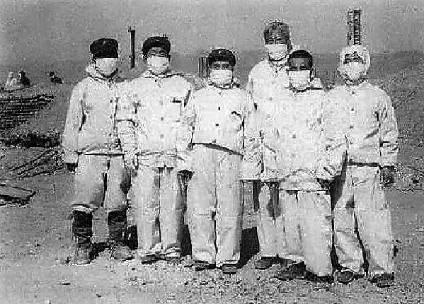 资料照片:1966年,程开甲(左一)在氢弹试验现场