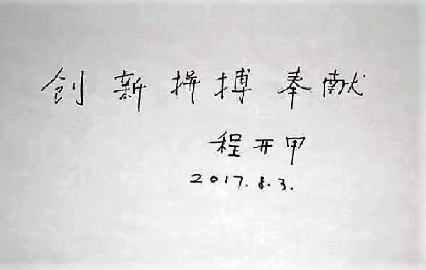 资料照片:2017年8月3日,程开甲在自己生日当天题下的“创新 拼搏 奉献”词