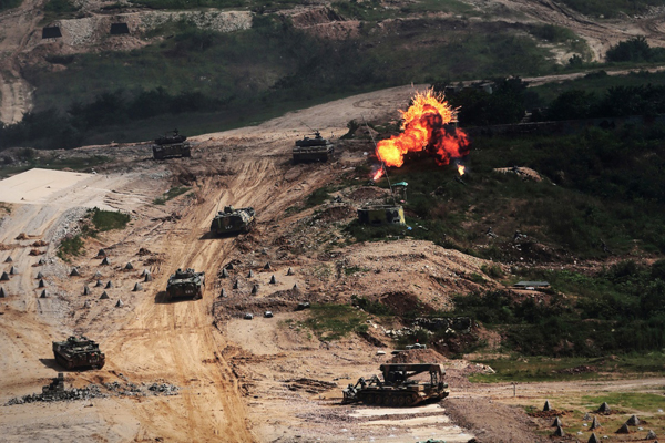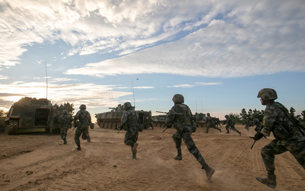 陆军第71集团军某旅“王杰班”的战士在野外训练场进行步坦协同战术演练(9月5日摄)。新华社发(王磊 摄)