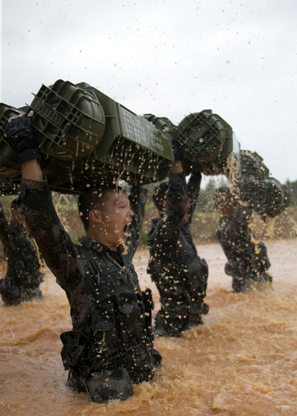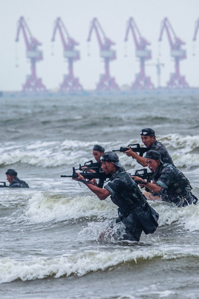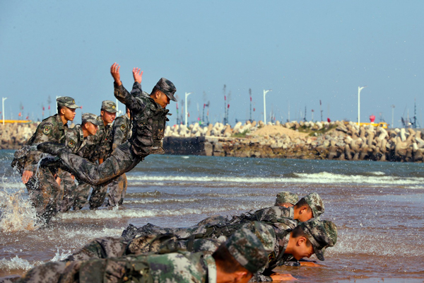 陆军第71集团军某旅“王杰班”的战士在海训期间进行抢滩登陆训练(2016年7月20日摄)。新华社发(王磊 摄)