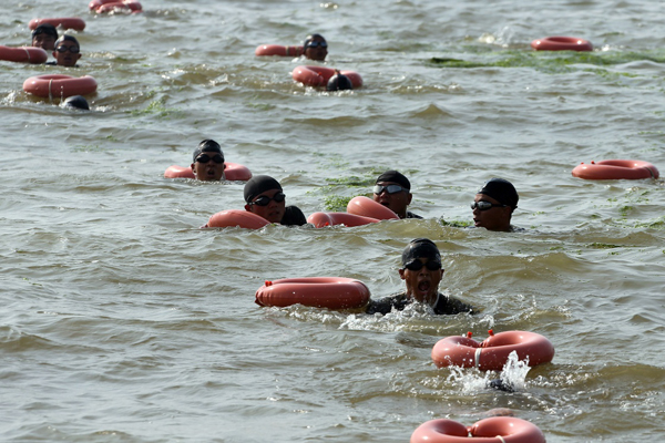 陆军第71集团军某旅“王杰班”的战士在进行海上极限体能训练(7月21日摄)。新华社发(赵聪 摄)