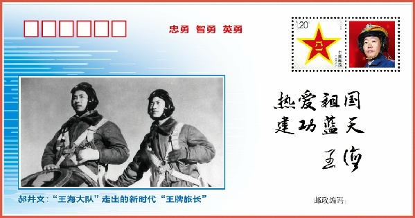 “热爱祖国、建功蓝天”,是空军一级战斗英雄王海对郝井文的点赞和勉励,在这套强军风采邮封上也有特别展现。老一辈战斗英雄勉励新时代空军飞行员努力飞得更快、飞得更高、飞得更远。