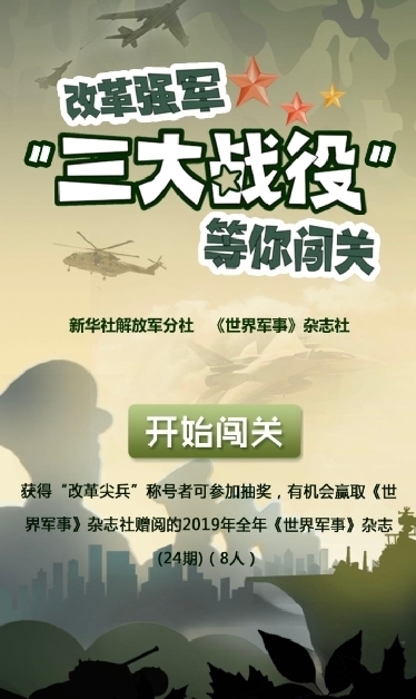 2018年12月31日,新华社解放军分社、《世界军事》杂志社联合推出答题游戏《改革强军“三大战役”等你闯关》,吸引了广大网友踊跃参加。