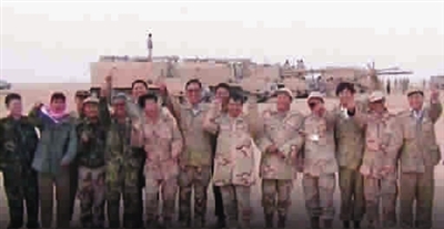 夜训在凌晨1点结束,科军就地露营,有五名中方人员也为了工作,挤在越野吉普车里眯一会,他们已在沙漠中连续工作了20多个小时!五个人来自不同单位,有军官,有翻译,有工程师,也有工人,他们不言苦,不叫累,团结互助,充满乐观主义精神。翻译老杨本来在上海工作,这次应聘当翻译,头一回参加打靶,一发炮弹的爆炸声曾把他吓了一跳,他问身边的卞教官:“炸点离咱们有多远?”卞教官笑着说大约1000米,他半信半疑。演习结束后,老杨感触颇深:“一没有想到你们的工作还这么辛苦,二没有想到我们的工作岗位离危险如此之近。不过,人生能有这么一次阅历也是挺难得的。”