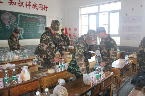 武警部队官兵将慰问品摆放在桌上,留给复课孩子。陈峰 摄