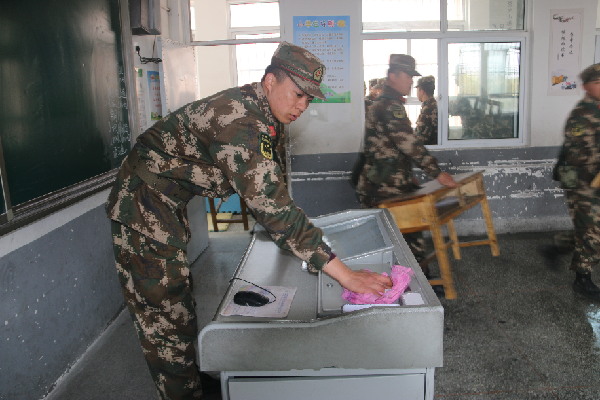 武警部队官兵在转移时打扫卫生,摆放桌椅。陈峰 摄