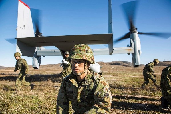 日本自卫队员搭乘美军“鱼鹰”运输机训练