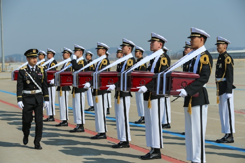 4月3日,在韩国仁川国际机场,韩方准备向中方礼兵交接中国人民志愿军烈士遗骸。中韩双方3日在韩国仁川国际机场举行第六批在韩中国人民志愿军烈士遗骸交接仪式。新华社记者 王婧嫱 摄
