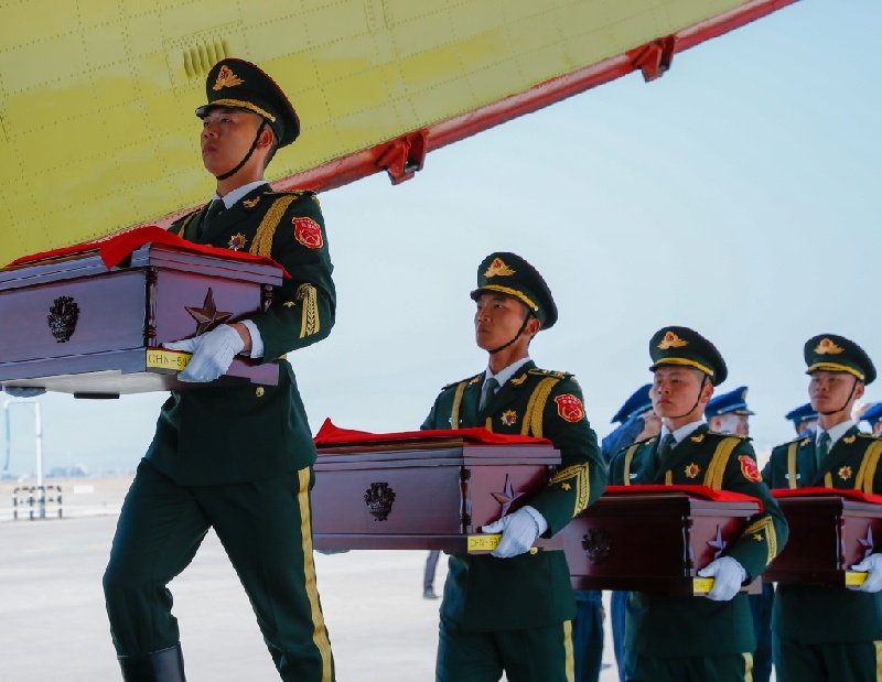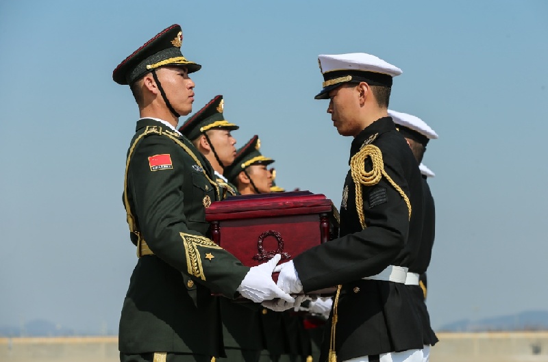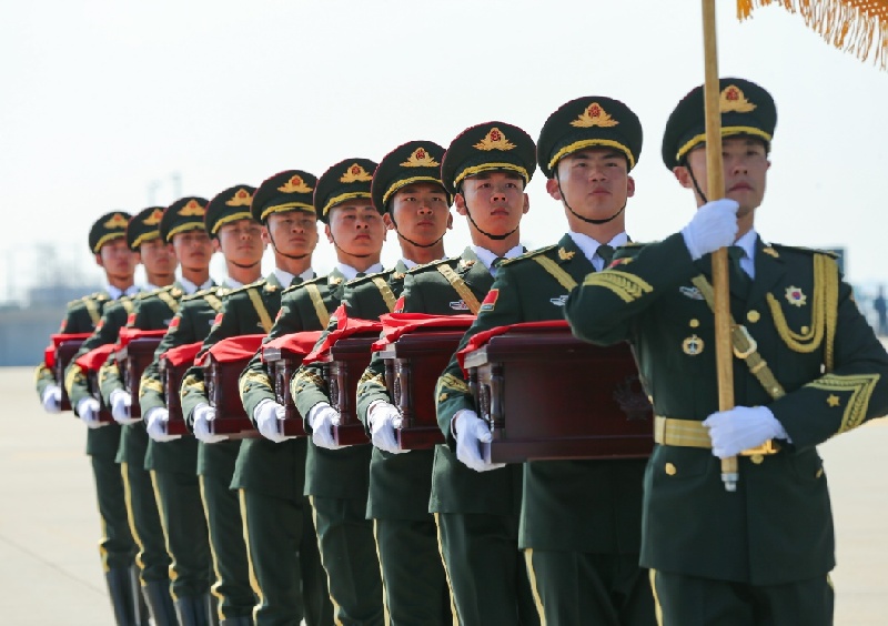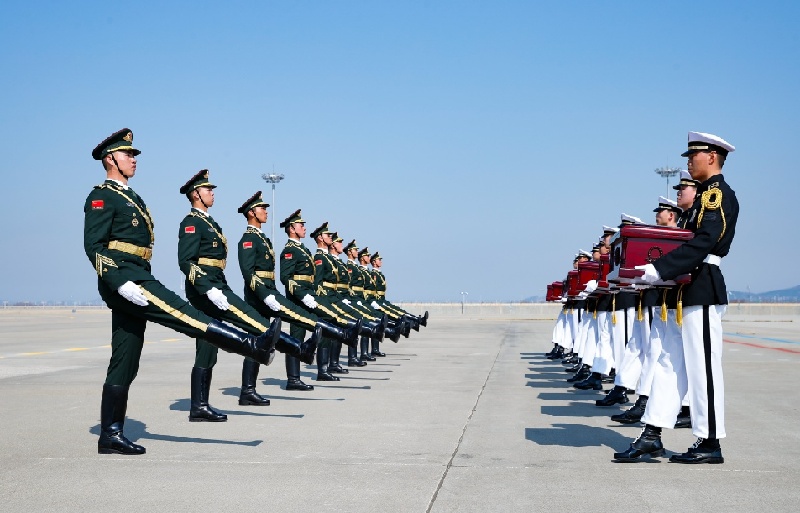 4月3日,在韩国仁川国际机场,中方礼兵护送志愿军烈士遗骸上飞机。中韩双方3日在韩国仁川国际机场举行第六批在韩中国人民志愿军烈士遗骸交接仪式。新华社记者 王婧嫱 摄