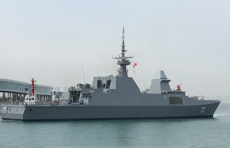 据了解,新加坡海军“坚强”号护卫舰(舷号72),排水量3200吨,长114.8米,宽16.3米,桅高35米,航速27节。