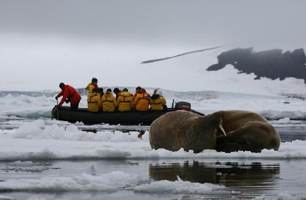 在北极航行的船只与海象。