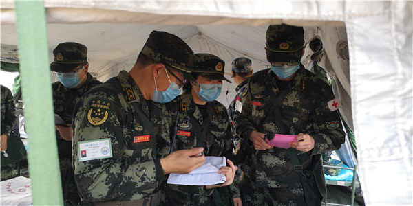 武警某部日前组织卫勤保障分队开展跨区基地化驻训演练。图为“留观后送组”核对“伤员”信息。郭靖 摄