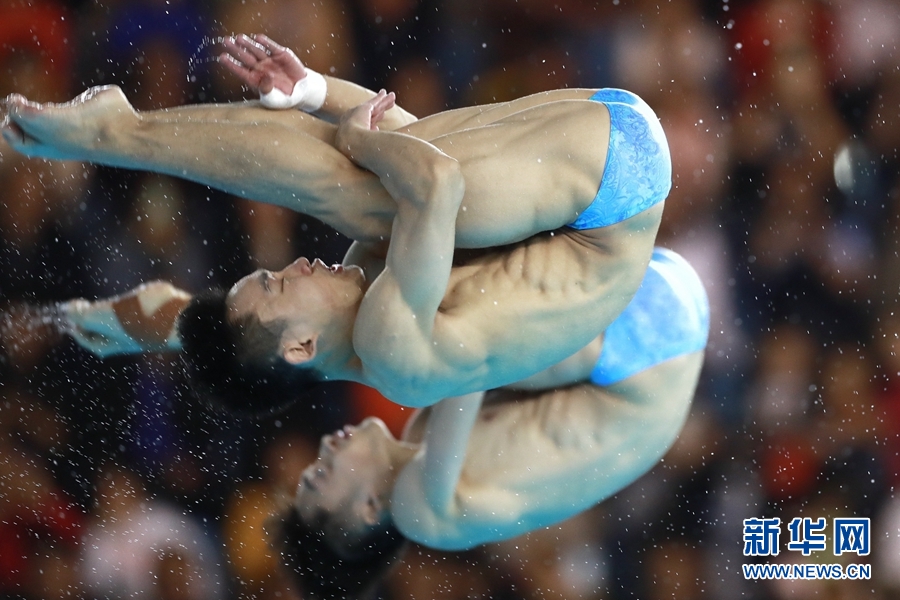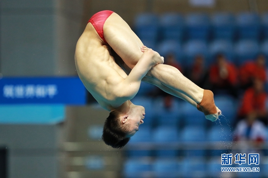 10月25日,谢思埸在比赛中。当日,在武汉举行的第七届世界军人运动会跳水项目男子3米跳板决赛中,中国选手谢思埸以556.75分的成绩夺得冠军,中国选手王宗源以502.90分的成绩获亚军。新华社记者 刘续 摄