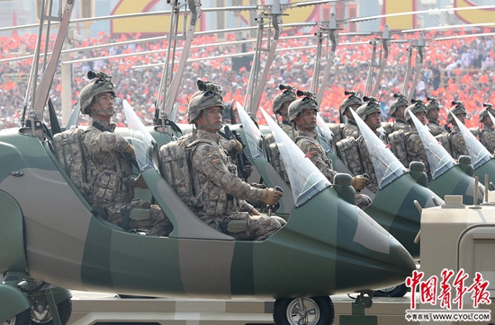 10月1日,庆祝中华人民共和国成立70周年大会上,装备方队官兵身着新式迷彩服接受检阅。中国青年报·中国青年网记者 赵迪/摄