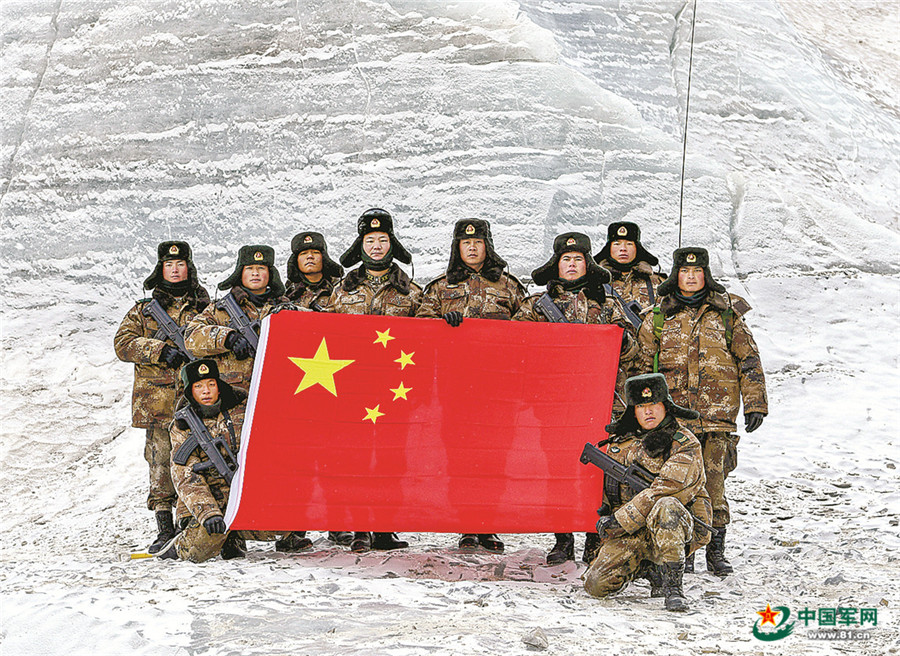 到达目的地后,官兵展开国旗向祖国和人民送上祝福。