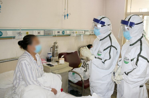 解放军总医院第五医学中心感染病医学部专家与患者谈心(2月13日摄)。新华社发(戴欣 摄)
