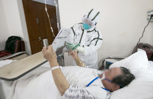 解放军总医院第五医学中心感染病医学部护士长吴丹帮助高龄患者读报(2月4日摄)。新华社发(郭阳虎 摄)