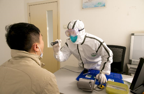 解放军总医院第五医学中心感染病医学部发热门诊医生在为疑似患者做初步检查(1月31日摄)。新华社发(郭阳虎 摄)