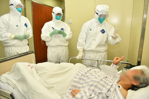 解放军总医院第五医学中心感染病医学部专家秦恩强(左三)查房时为患者鼓劲加油(1月31日摄)。新华社发(杨怡军 摄)
