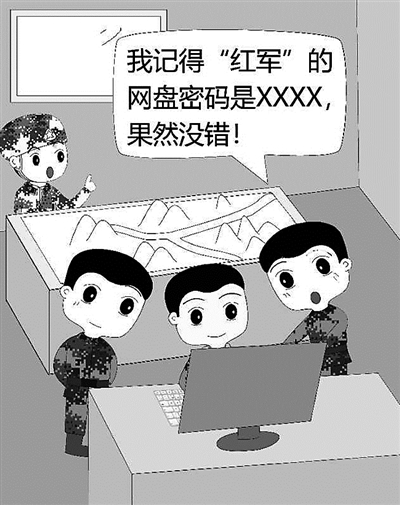 演练结束,这名文书坦言,他早就知道对方的网盘密码。原来,此前,各营文书为了便于工作交流,有时会使用网盘传输或分享文件,一些网盘用户名和密码不少人都知道。这次演练前,“蓝军”营文书在用网盘调取查阅资料时,无意中在对方网盘中发现了秘密。