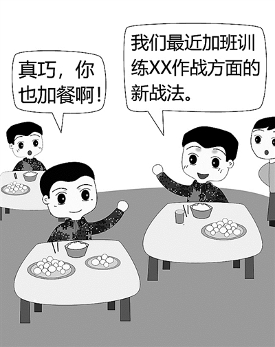 “真巧,你也来加餐啊。”“是啊,我们营最近在研训新战法,有时会加班训练……我跟你说,我们研究的新战法主要是××作战方面,据说要在全旅推广呢!”