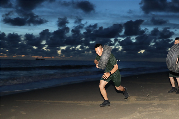 特战队员进行扛轮胎比赛