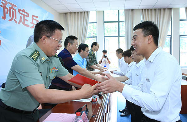 7月3日,在重庆市巴南区《大学生预定兵通知书》发放仪式上,来自重庆工程学院的60名大学生预定兵代表,领到了由巴南区征兵办公室颁发的《大学生预定兵通知书》。“我大学一毕业就拿到了通往军营的‘金钥匙’,我一定在军营这个大熔炉百炼成钢立功受奖,早日向人武部和学校报喜。”本科应届毕业生张维清拿到《大学生预定兵通知书》后激动地说。