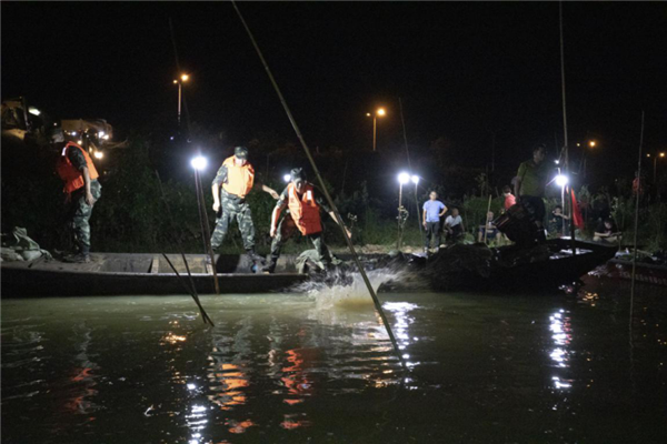 武警岳阳支队官兵携带救生衣、铁锹等抢险器材,奔赴现场。到达任务地点后,救援人员分为两组展开行动。