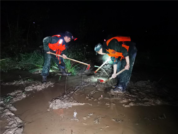 7月22日,岳阳县大毛家湖垸出现较大险情,武警岳阳支队十余名官兵连夜奋战7小时,成功排除险情。展灿 摄