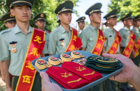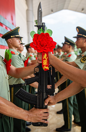 在机动支队,满服役期士兵与留队士兵进行枪支交接。