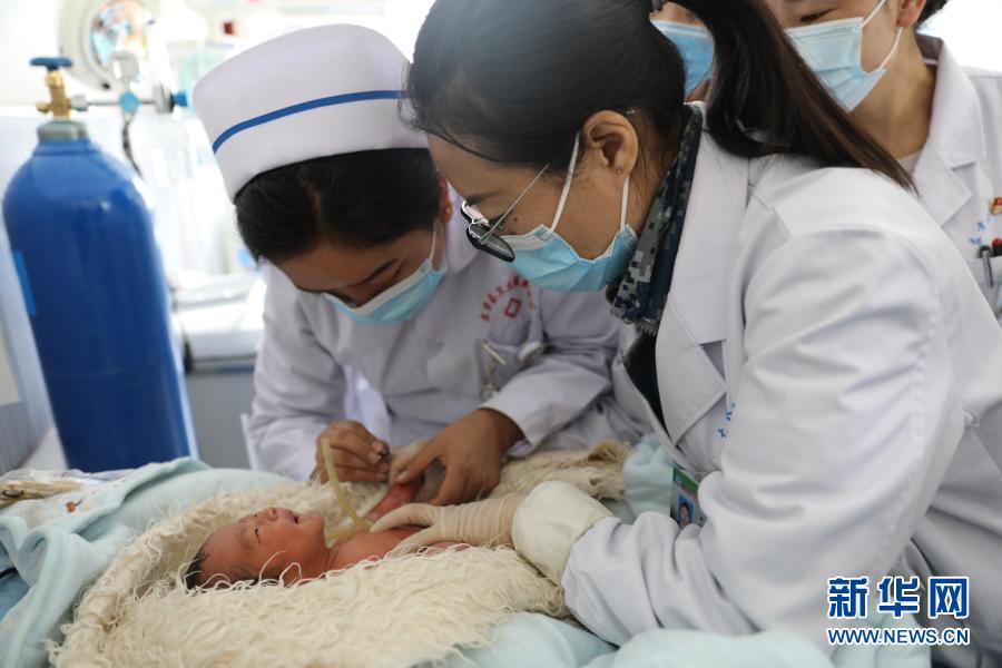 在新生儿病房,空军特色医学中心援藏医疗队队员(右)带教左贡县人民医院医护人员(左)实施静脉穿刺(7月17日摄)。新华社发(张洪涛 摄)