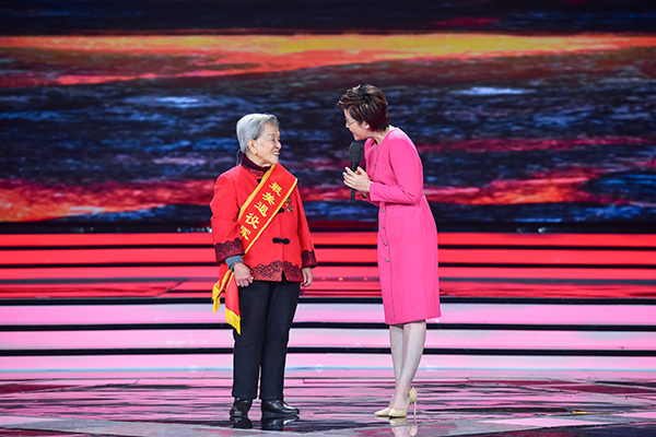 在2020年度“最美退役军人”发布仪式上,王昌群(左)与主持人交流。新华社发(王峰 摄)
