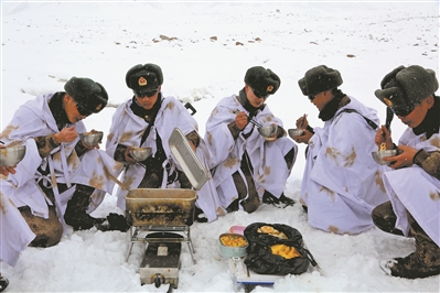 寒冬时节,新疆喀什军分区克克吐鲁克边防连官兵在巡逻途中吃上热乎乎的饭菜。姬文志 摄