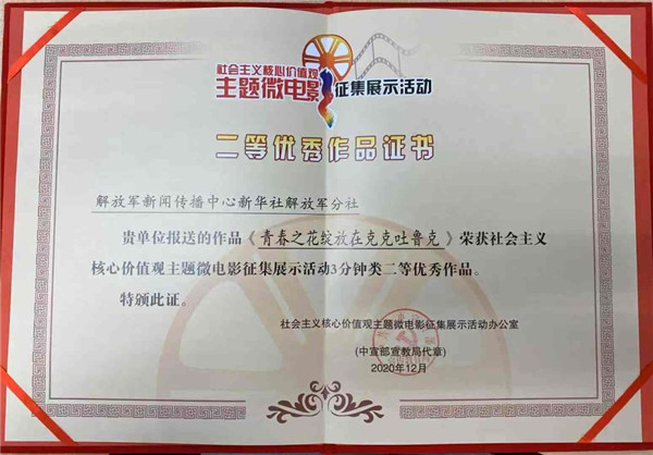 第四届社会主义核心价值观主题微电影征集展播活动评选结果日前揭晓,解放军新闻传播中心新华社解放军分社申报的《青春之花绽放在克克吐鲁克》获“3分钟类二等优秀作品奖”。
