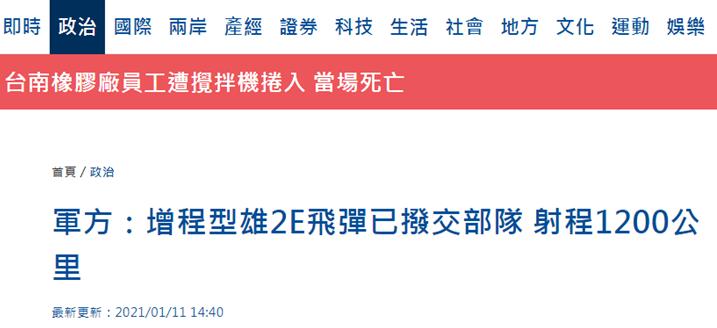 台媒援引台军人士的话报道称,增程型“雄风二E”巡航导弹已经小批量列装台军部队,还炒作这种导弹射程高达1200公里,能有效打击大陆的非沿岸军事设施。
