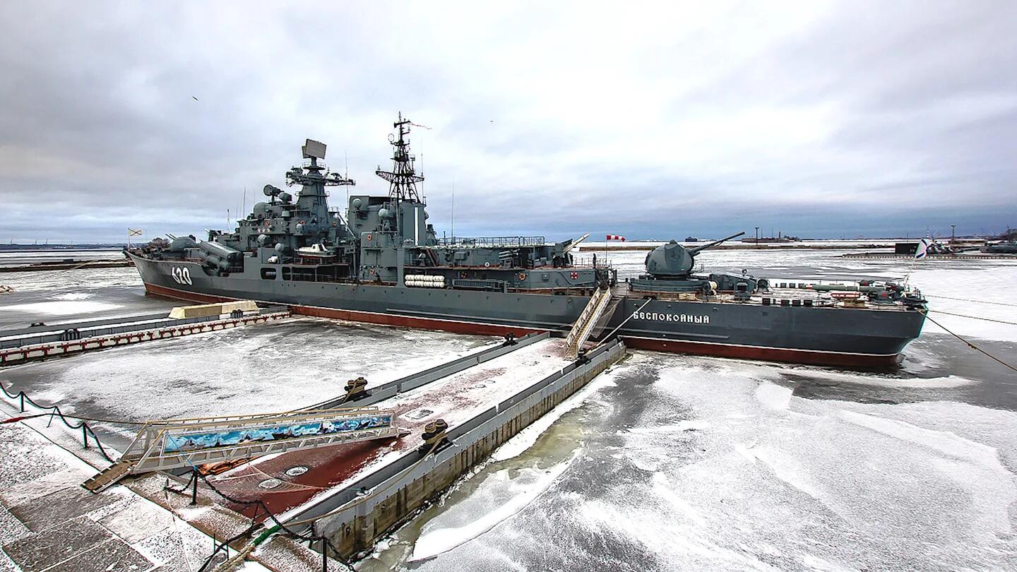 在岸边停靠的俄罗斯海军“现代”级驱逐舰