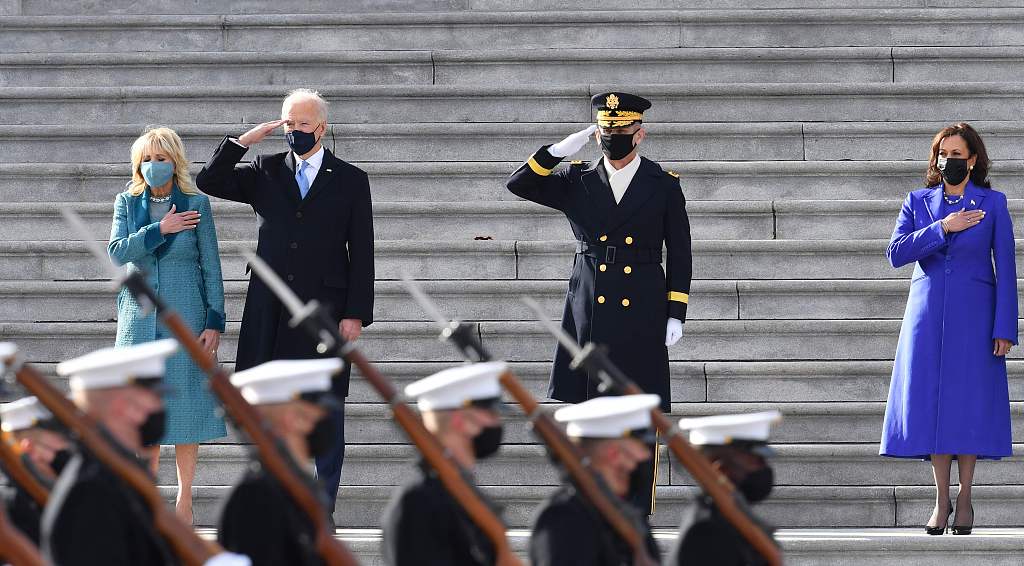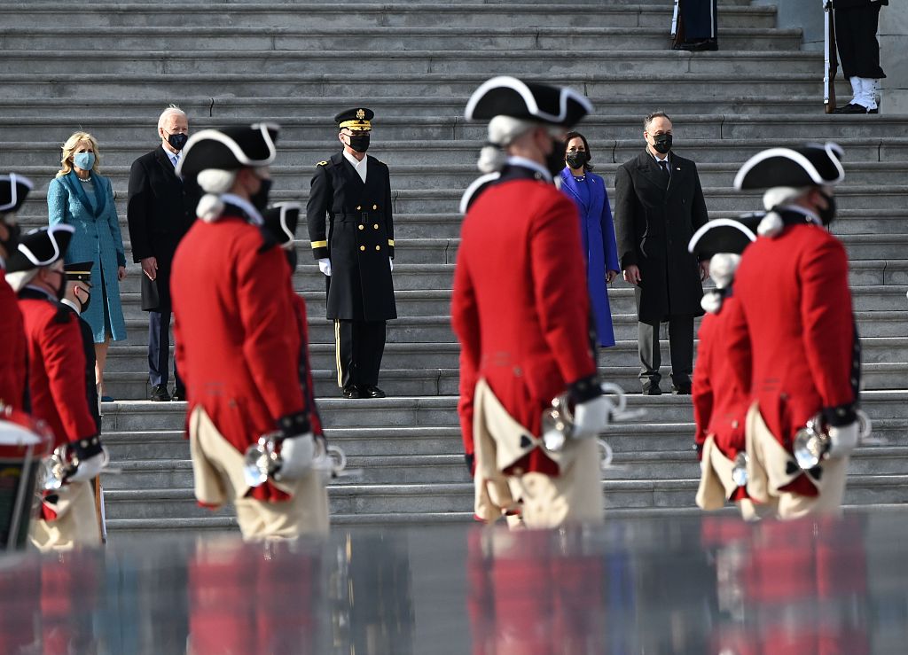 当地时间2021年1月20日,美国华盛顿特区,美国总统拜登和副总统哈里斯在检阅军队仪式中检阅美军的准备情况。
