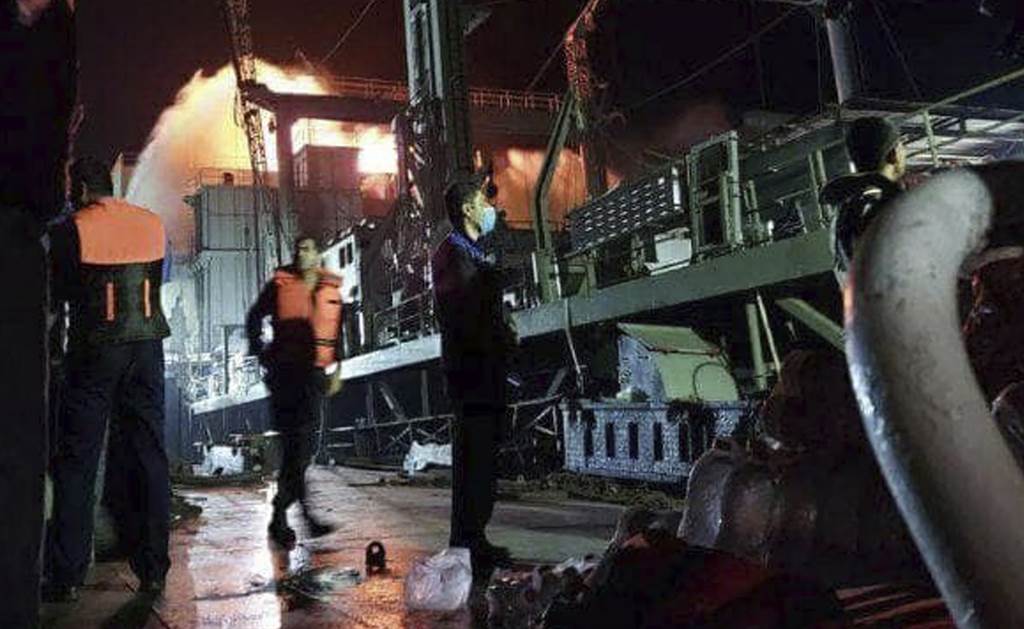 在伊朗社交媒体上,流传着身着救生服的水兵撤离军舰的画面,他们身后是燃烧着的大火。最新曝光的视频显示,直到6月2日清晨,这艘军舰冒着浓浓的黑烟。