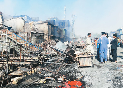 8月8日,阿富汗北部昆都士省首府昆都士市被战火摧毁的商铺。