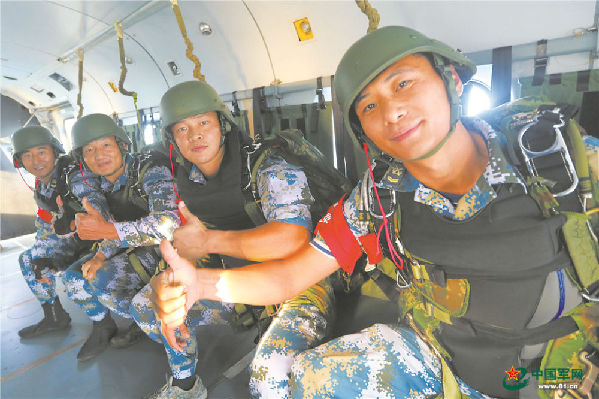 “保持离机姿势,注意离机间隔……”起飞后,投放员不断叮嘱队员,同时仔细检查伞具背挂情况。飞机抵达预定空域,担任首跳任务的某连连长仁青才仁透过舷窗向下观察,聚精会神寻找伞降时机。
