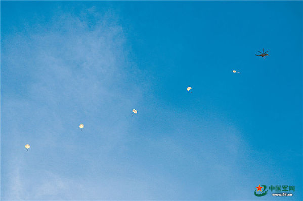 “请示伞降!”找准时机后,他迅速向指挥员报告并获准伞降。伴着刺耳的警报声和闪烁的红色报警灯,直升机尾门打开,仁青才仁纵身一跃,飘向目标区域。