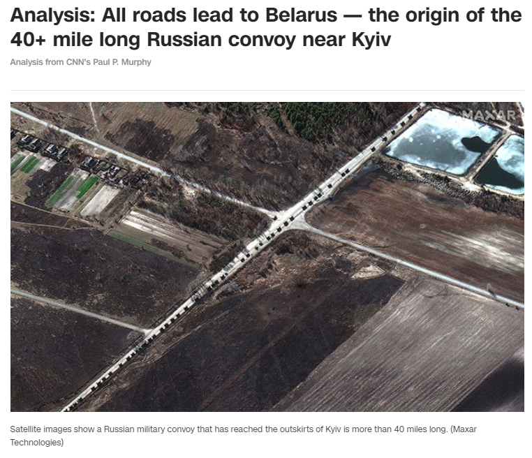 据美国有线新闻网络(CNN)报道称,美国Maxar 技术公司最新卫星图像显示,乌克兰首都基辅附近的俄军车队比之前测量的还要长,有至少40多英里(约64.4公里)。车队由装甲车、坦克、牵引火炮和其他后勤车辆组成,从距离基辅市中心约17英里(约27.4公里)的安东诺夫空军基地,一直延伸到乌克兰普里比尔斯克以北。普里比尔斯克小镇距离乌克兰-白罗斯边境比离基辅更近。