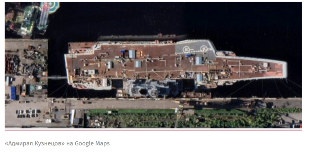 《乌克兰真理报》报道中的配图,该媒体称这是谷歌地图中的“库兹涅佐夫海军上将”号航母的图像