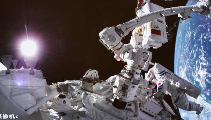 目前,两名出舱航天员已完成安装脚限位器和舱外工作台等工作,后续将在小机械臂的支持下,相互配合开展舱外助力手柄安装、载荷回路扩展泵组安装、舱外救援验证等作业。航天员刘洋在核心舱内配合支持两名出舱航天员开展舱外操作。这是航天员蔡旭哲首次执行出舱活动任务。