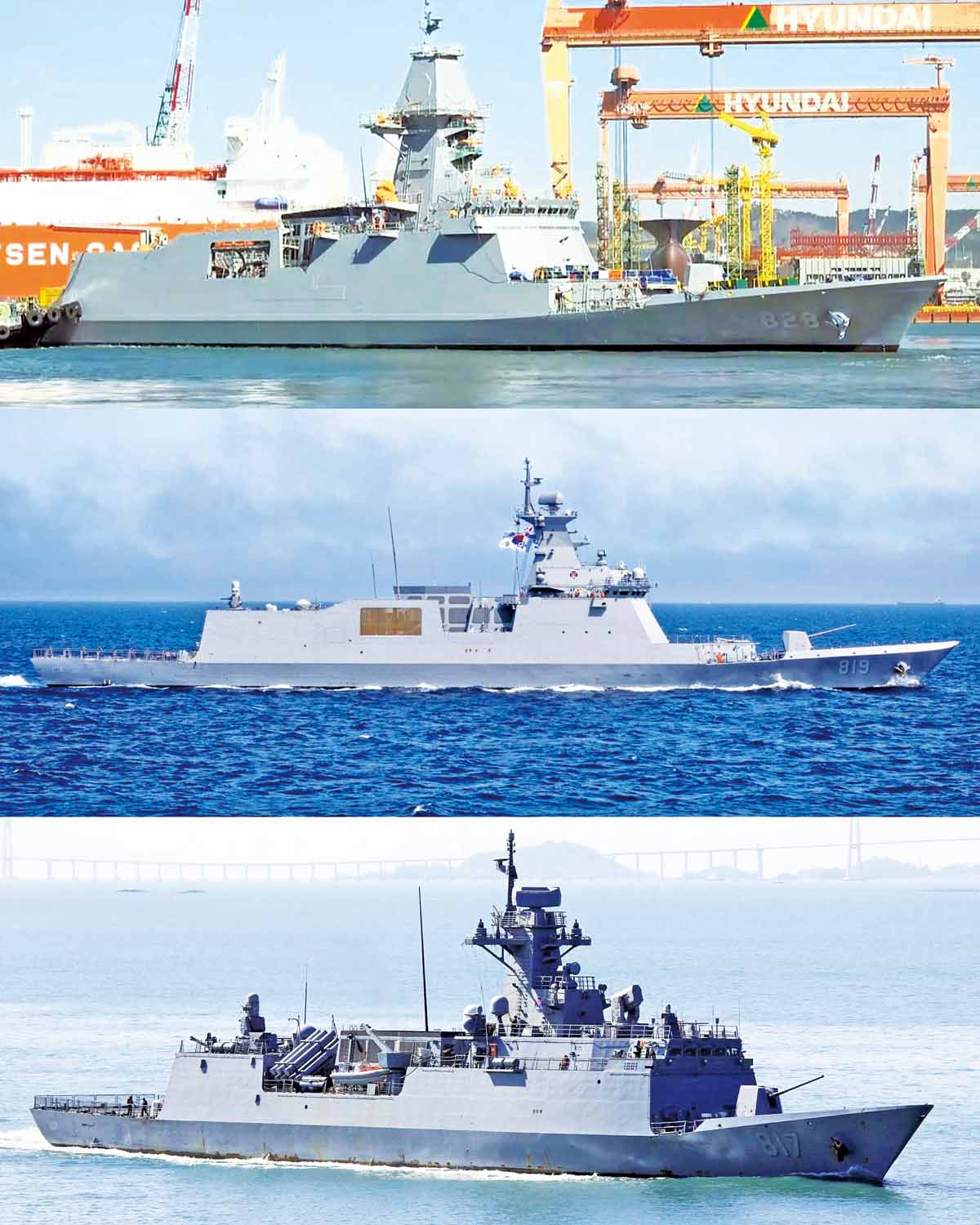 从上至下依次为:FFX-Ⅲ级首舰“忠南”号、FFX-Ⅱ级首舰“大邱”号和FFX-Ⅰ级首舰“仁川”号。