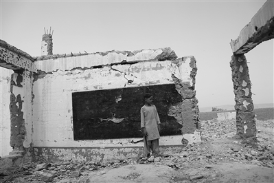 2022年8月23日,在阿富汗南部赫尔曼德省桑金地区,一个小孩站在废墟之中