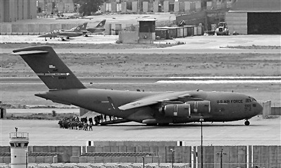 2021年8月30日,美国士兵在阿富汗喀布尔国际机场登上一架军机准备撤离