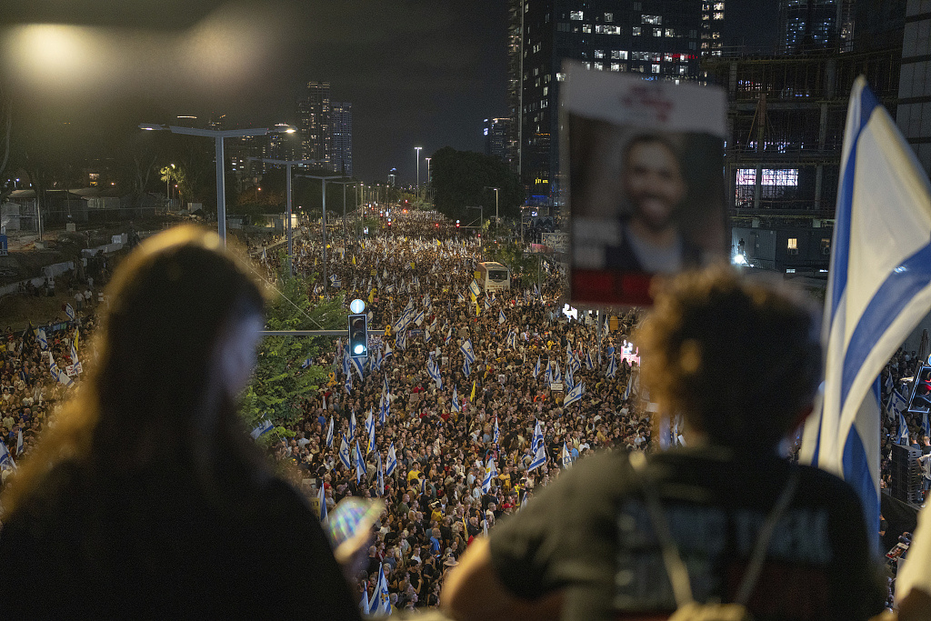 CNN2日描述称,在当天的特拉维夫示威现场,人们挥舞着以色列国旗,高喊“你们并不孤独,我们与你们同在”等口号,举着写有“达成协议”“一份协议可以拯救他们”等标语的牌子。
