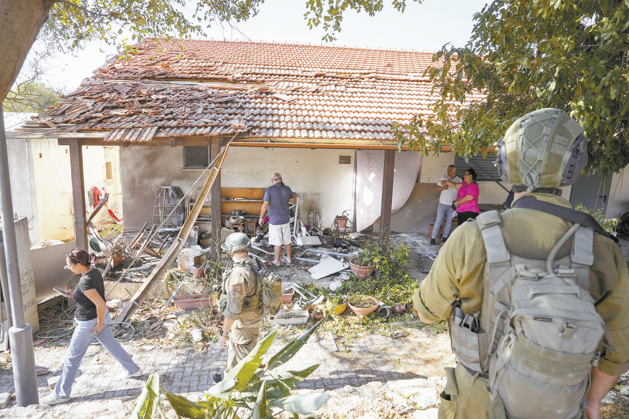 当地时间25日,以色列安全部队检查一栋被从黎巴嫩发射的火箭弹击中的房屋。(视觉中国)